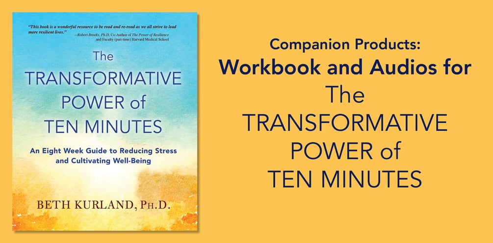 Welcome on the path towards greater well-being with this workbook, audio meditation collection, and set of weekly reflections for inspiration. These are companion materials that go along with the book "The Transformative Power of Ten Minutes: An Eight Week Guide to Reducing Stress and Cultivating Well-Being" by psychologist Beth Kurland, Ph.D. Before using these products, be sure to buy the book, which can be found at BethKurland.com. Included are 64 daily worksheets, 26 audio meditations, and 8 weekly reflections that correspond to the eight chapters of the book. This kit is a free product for those who have already purchased the book.